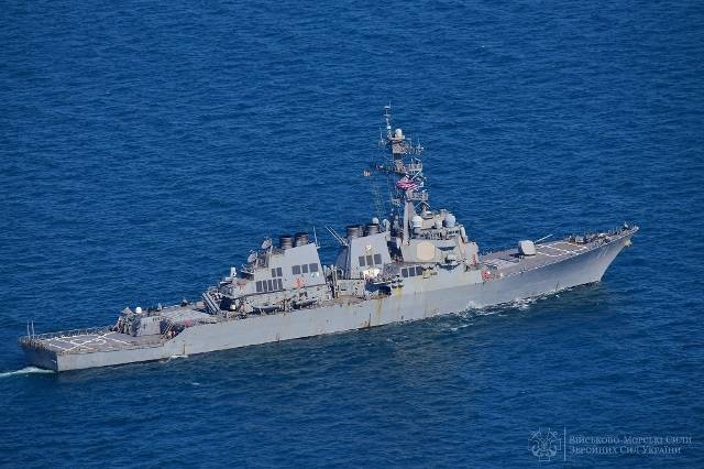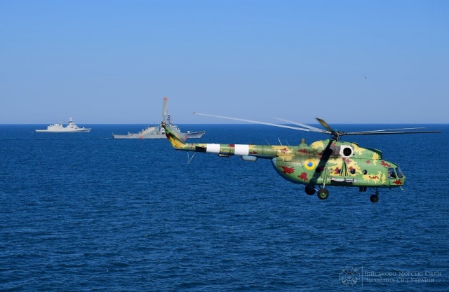 Un helicóptero Mil Mi-8MSB de la marina ucraniano, al fondo el destructor USS “Ross”