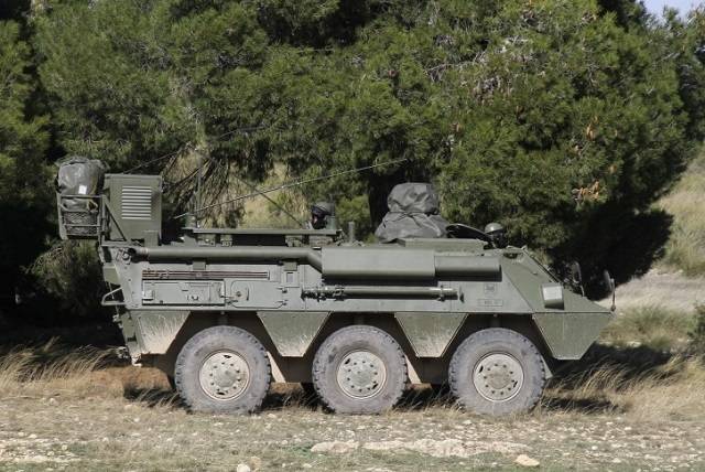 Uno de los Vehículo de Exploración de Caballería (VEC) del “Sagunto”, situado discretamente entre pinos en lo alto de una montaña.