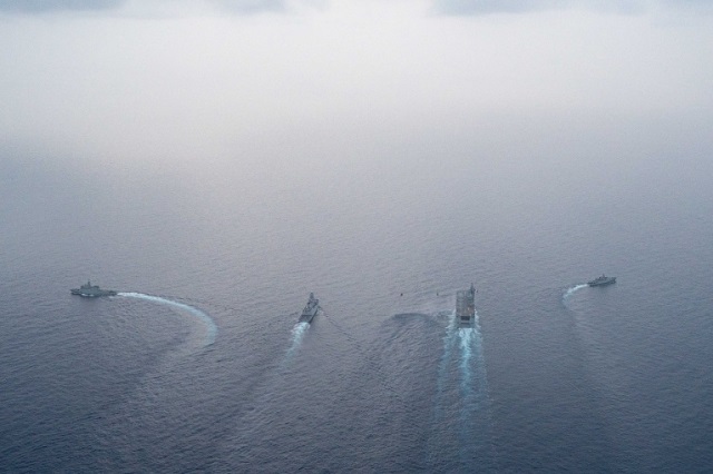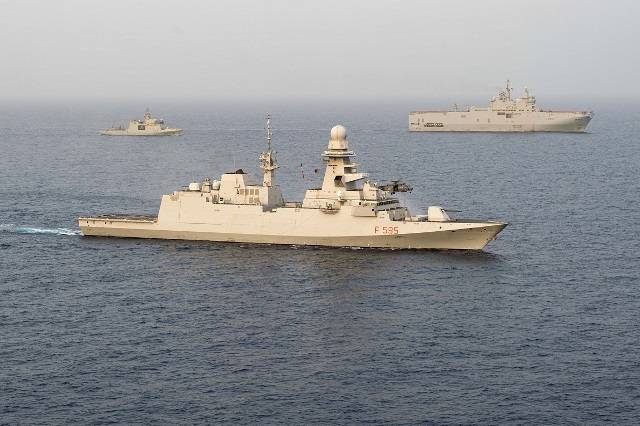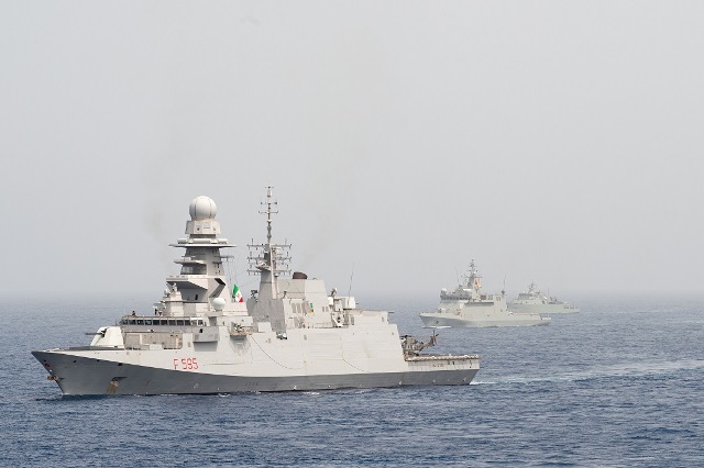 La fragata italiana “Luigi Rizzo”, y los dos OPV, navegando en formación.