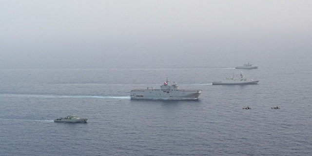 Fotografía: En primer plano vemos a la italiana “Luigi Rizzo”, en segundo plano el navío anfibio “Dixmude” y el BAM español “Furor”.