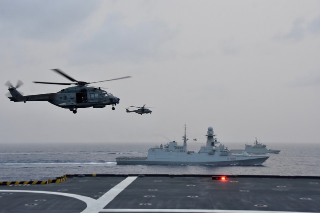 Desde la cubierta de vuelo del “Dixmude” podemos ver dos NH90, la fragata italiana “Luigi Rizzo”, y el BAM “Furor”.