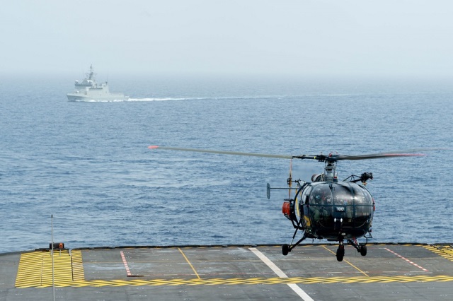 En primer plano un veteranísimo helicóptero Alouette III de la Marina Nationale francesa tomando en la cubierta de vuelo del “Dixmude”, al fondo se ve al BAM “Furor”.