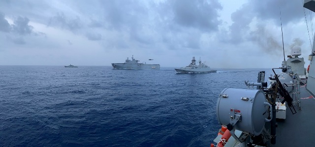 Desde el costada de estribor del “Furor” se observan navegando al anfibio francés, la fragata italiana y el OPV portugués.
