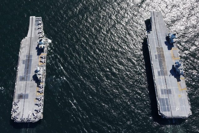 El pasado 20 de mayo navegaron juntos por primera vez los nuevos portaaviones de la Royal Navy de Reino Unido, el HMS “Queen Elizabeth” y el HMS Prince of Wales”. El escenario del encuentro fue el Canal de la Mancha, cerca de la base de Portsmouth, puerto base los dos portaaviones. El HMS “Queen Elizabeth” regresaba a su base tras participar en unas maniobras para garantizar su preparación para cualquier situación durante el próximo despliegue global de siete meses que le llevará hasta el escenario de Asia-Pacifico, encabezando su Grupo de Ataque o Carrier Strike Group.