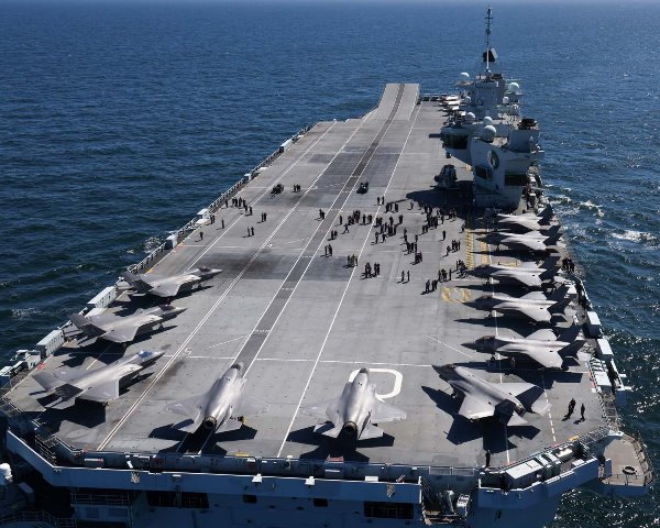 En primer plano, el HMS “Queen Elizabeth” con varios F-35B, tanto británicos como de los Marines de Estados Unidos, trincados en su cubierta de vuelo.