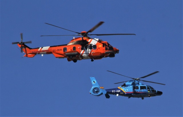 Pasada de un Airbus Helicopters H225 “Cougar” de Salvamento Marítimo (arriba) y SA-365N-1 “Dauphin” de Aduanas.