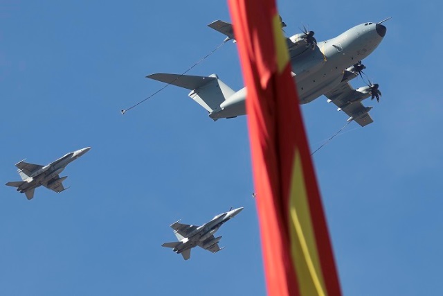 Un Airbus DS A400M simula repostar a dos EF-18M. en el centro de la imagen la bandera de España, sita en la plaza de Colón. (foto Javier Sánchez)