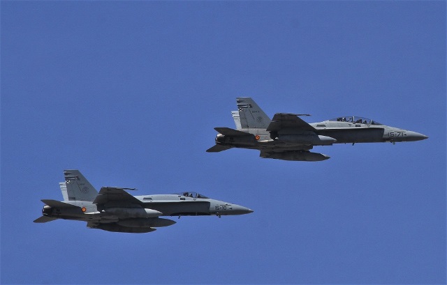 Dos EF-18M del Ala 15 volando sobre el Madrid.