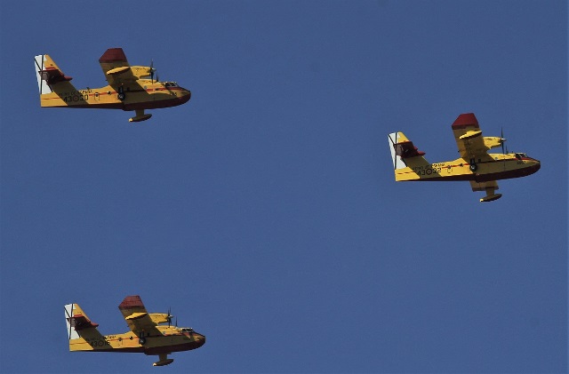 Tres apagafuegos CL-215T/CL-415 del 43 Grupo, los héroes que combaten los incendios que asolan España sobre todo en época estival.