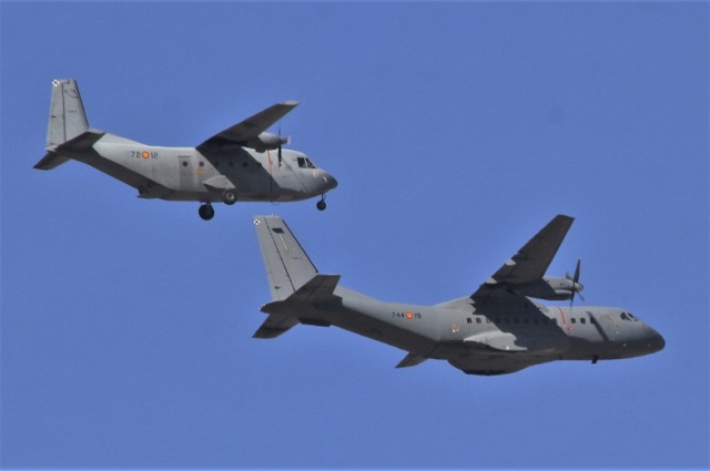 Pasada de dos transportes del Ejército del Aire, en concreto un incombustible CASA C-212 (izquierda) y un CN235 de la Escuela de Transporte de Matacán (Salamanca).