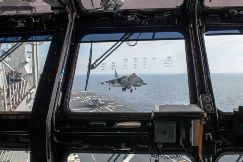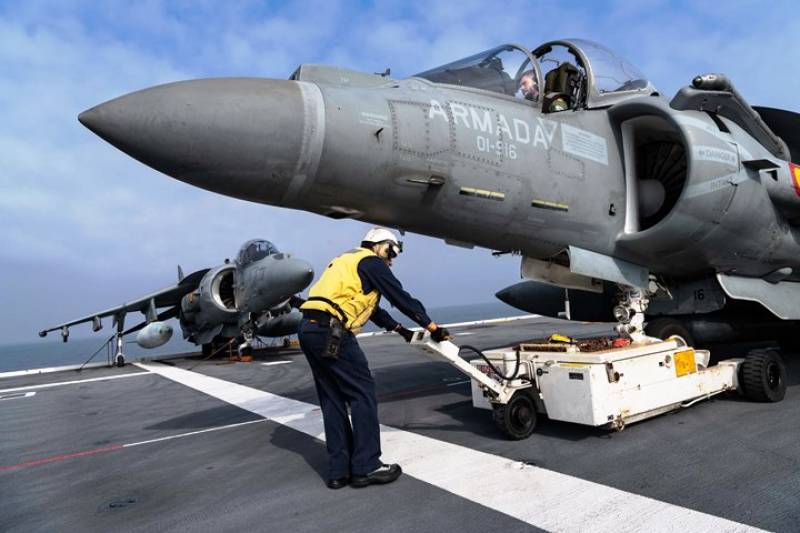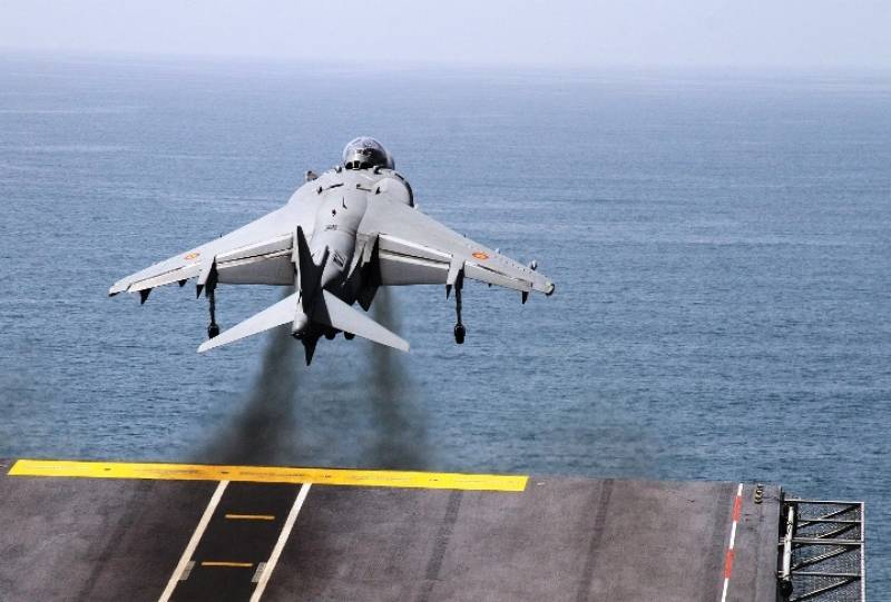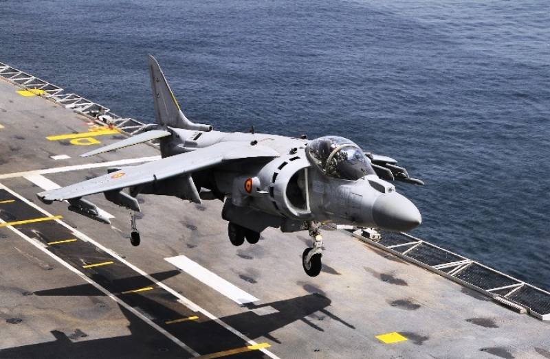 Un AV-8B Plus “Harrier II” tomando en la cubierta del LHD (Landing Helicopter Dock) “Juan Carlos I”, buque insignia de la Armada española. (foto: Julio Maíz/defensa.com)