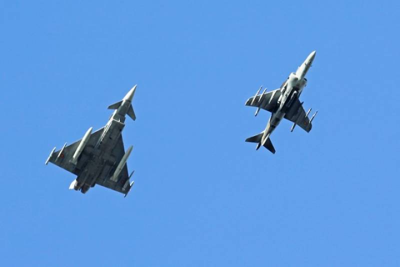 Una formación entre un AV-8B Plus (derecha) de la Armada y un Eurofighter del Ejército del Aire. (foto: Javier Sánchez)