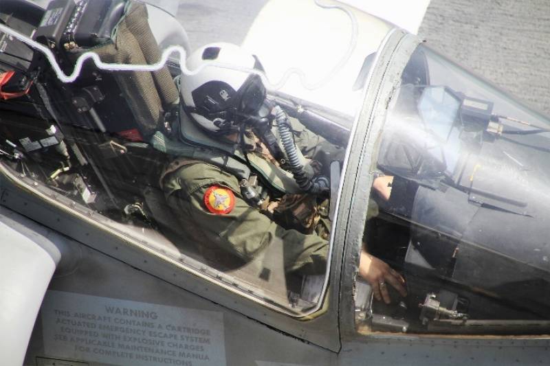 Un piloto de la 9ª Escuadrilla en la cabina de su “Harrier II”, tras aterrizar en el LHD “Juan Carlos I”. (foto: Julio Maíz/defensa.com).
