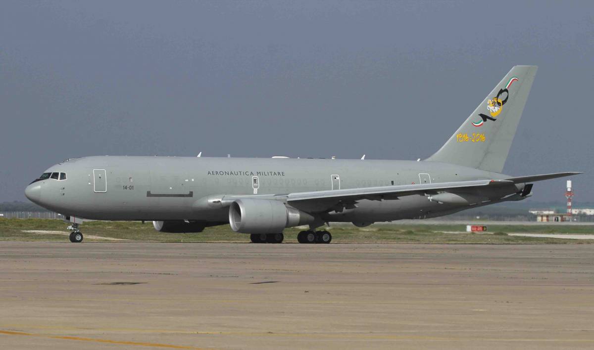 Uno de los KC-767A rodando, su cola recuerda el centenario de la creación de la unidad predecesora.(Julio Maíz/defensa.com)