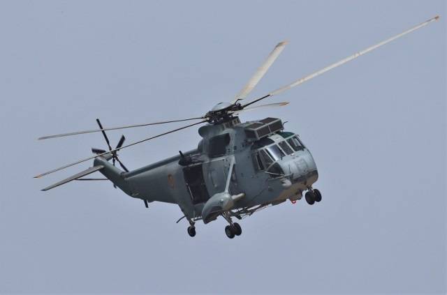 Un helicóptero AB-212 de la Tercera Escuadrilla de la Armada apoyando con sus armas el desembarco.