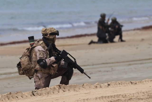 Vehículos 8x8 “Piranha” desembarcando desde las lanchas de desembarco LCM-1E,