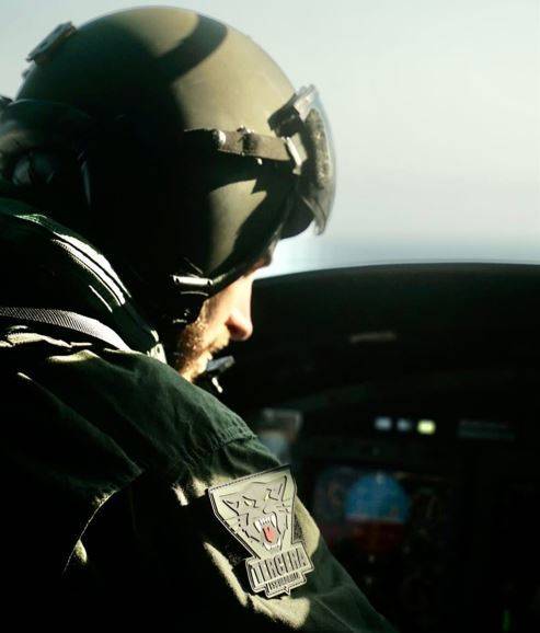 Un piloto de la Tercera Escuadrilla de la FLOAN, como denota su parche, con el gato que aparece en su escudo.