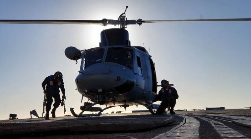Uno de los helicópteros AB-212 de la Tercera Escuadrilla de la Armada en la cubierta de vuelo de un navío.