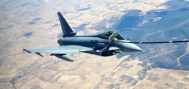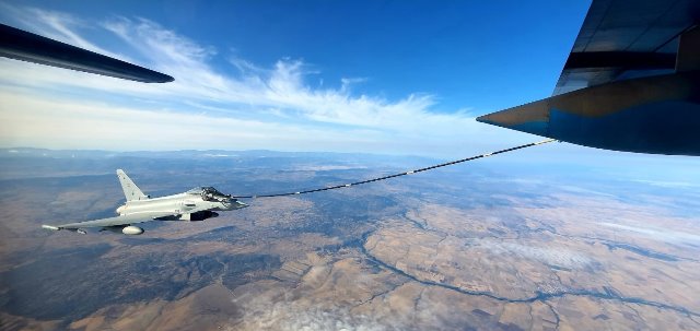 Un Eurofighter del Ala 14 es reabastecido en vuelo por parte de un KC-130H “Hercules”. (foto Ejército del Aire)