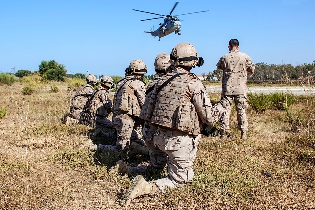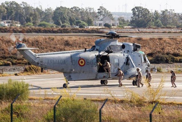 Infantes de Marina desembarcando de un “Sea King”, en una zona de instrucción de San Fernando (Cádiz). (foto Rubén Galindo)