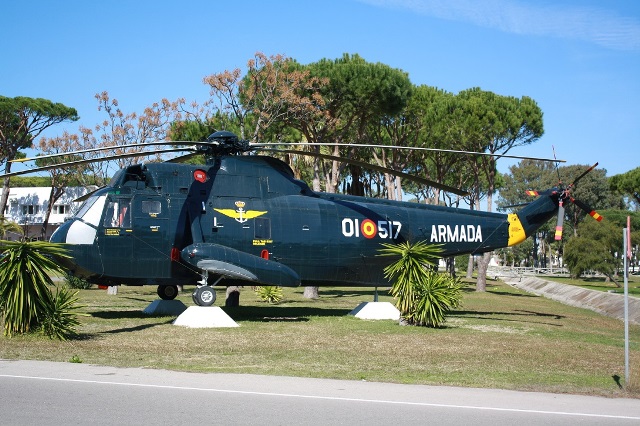 En la entrada de las instalaciones de la Flotilla de Aeronaves (FLOAN) se conserva un “Sea King” con la pintura azul marina que llevaban cuando realizaban el rol antisubmarino o ASW. (foto Julio Maíz)