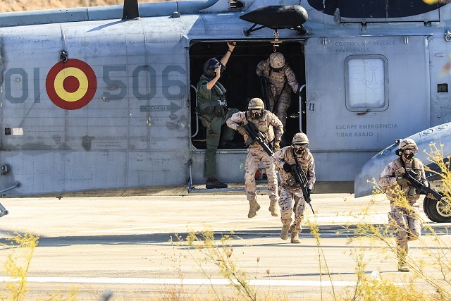 Infantes de Marina durante el entrenamiento para habituarse a embarcar/desembarcar de los “Sea King”, que junto a los AB-212 son sus “caballos de batalla”. (foto Rubén Galindo)