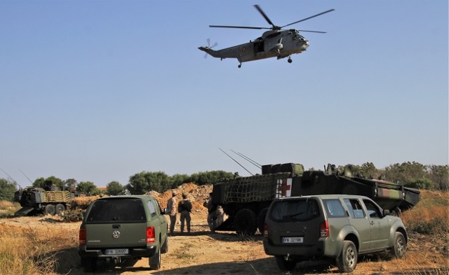 Un “Sea King” pasa encima de los medios del Batallón Mecanizado de Infantería de Marina. (foto Julio Maíz)