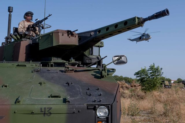 Curioso encuadre de un “Sea King” bajo el cañón de este 8x8 “Piranha” IIIC del Tercer Batallón de Desembarco Mecanizado (BDMZ-III) del Tercio de Armada (TEAR). (foto José Antonio Almarza)