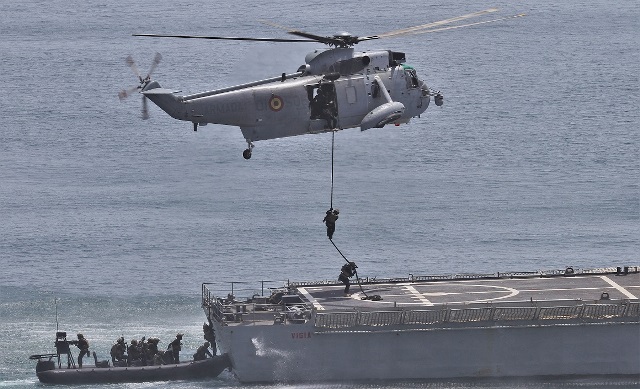 Miembros de la FGNE embarcando en un “Sea King” en la cubierta del LHD “Juan Carlos I”. (foto Julio Maíz)