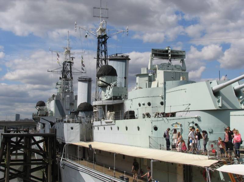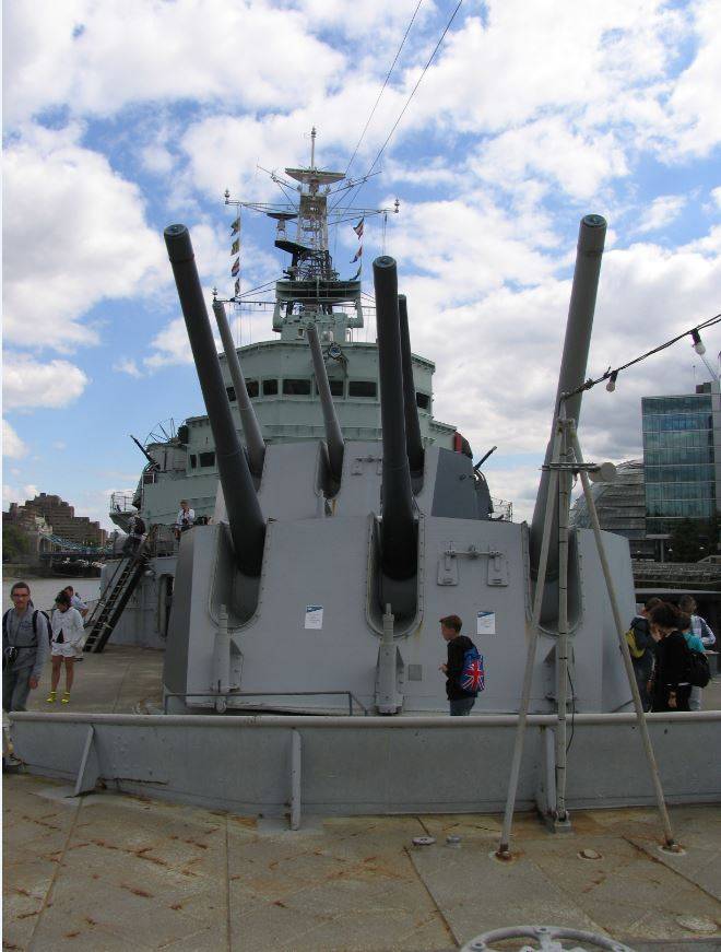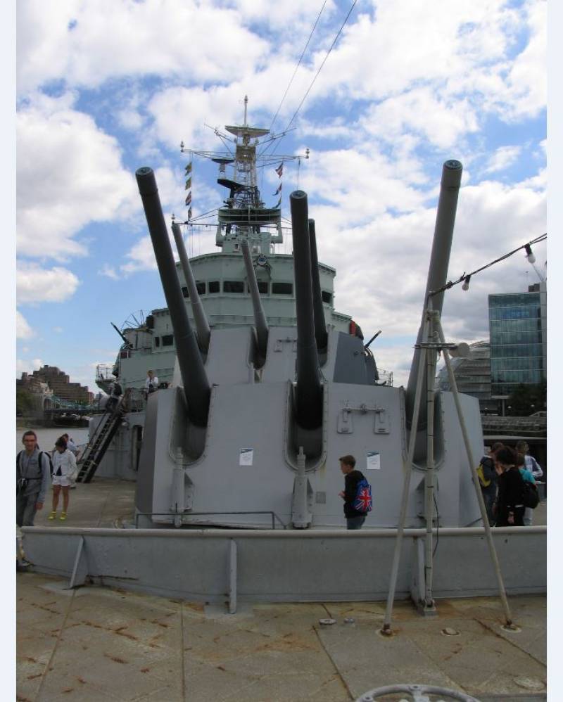 Anclado en el río Támesis y no lejos del Tower Bridge, el crucero ligero HMS Belfast ostenta un importante pasado, hoy traducido en museo. En sus nueve cubiertas se explica su historia, incluida la vida a bordo y participación en las diferentes acciones de guerra y en la paz. Construido en la ciudad irlandesa de donde toma su nombre, fue botado el día de San Patricio de 1938. A principios de la II Guerra mundial resultaría averiado por una mina lanzada por un submarino alemán. Una vez reparado, participó en múltiples acciones militares durante el conflicto, incluido su apoyo en el desembarco de Normandía durante el día D. Años después tomaría igualmente parte en la Guerra de Corea. Modernizado a finales de la década de los años cincuenta, incorporaría nuevas direcciones de tiro para la artillería principal y secundaria, protección NBQ y otros aspectos técnicos que le permitieran actualizar su operatividad hasta la retirada del servicio activo.