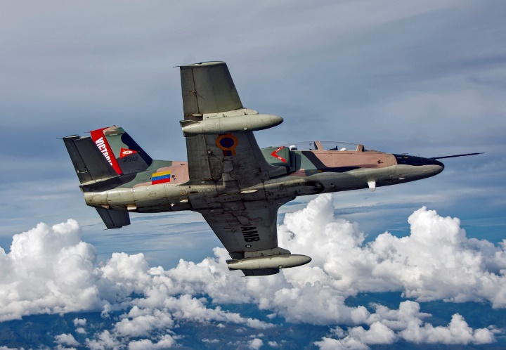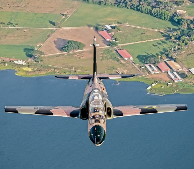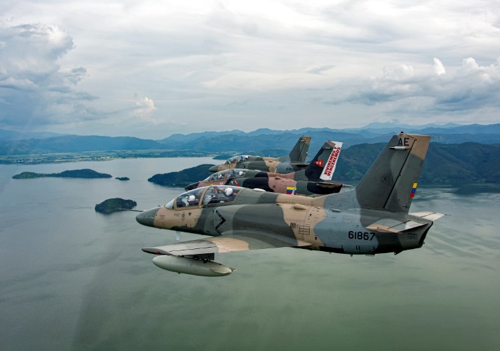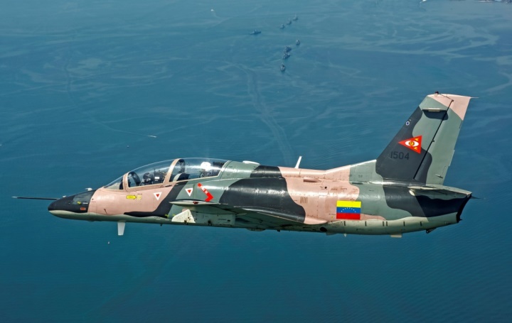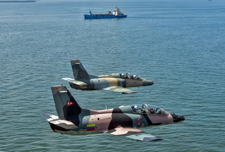 Vuelo en formación de dos K-8W pertenecientes al Grupo Aéreo de Operaciones Especiales Nº15 realizando una misión de vigilancia costera sobre el Lago de Maracaibo.