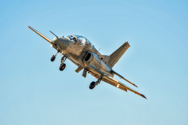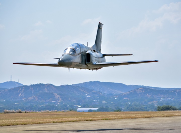 Pasaje rasante de un K-8W del Grupo de Caza Nº 12 sobre la base aérea Teniente Vicente Landaeta Gil en Barquisimeto.