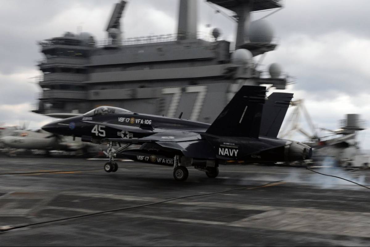 Océano Atlántico, 5 de diciembre de 2010: El capitán Dan “Dozer” Dwyer, comandante del Strike Fighter Squadron (VFA) 106, aterriza con un F/A 18C conmemorativo del Centenario en el USS “George H.W. Bush” (CVN 77) en tareas de entrenamiento (foto US Navy/