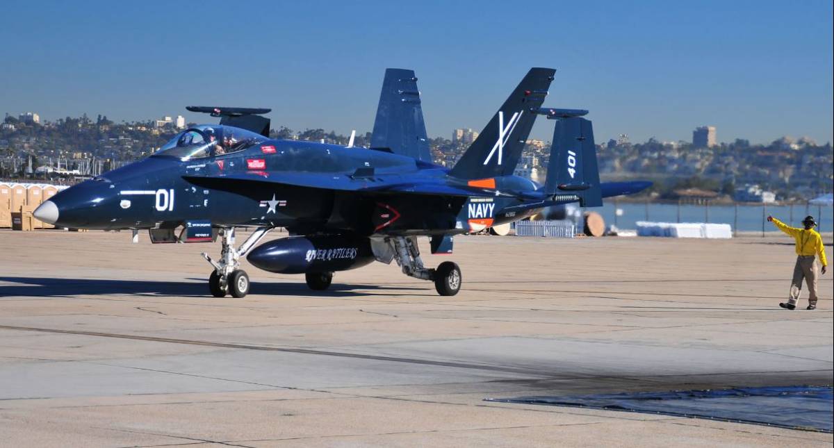 San Diego, 11 de febrero de 2011: Un F/A-18 pilotado por el teniente Jack Stewart, asignado a los “Delfines Azules” del Fighter Attack Squadron (VFA) 203, rueda por la línea de vuelo del la Naval Air Station de North Island. Cientos de actuales e históric