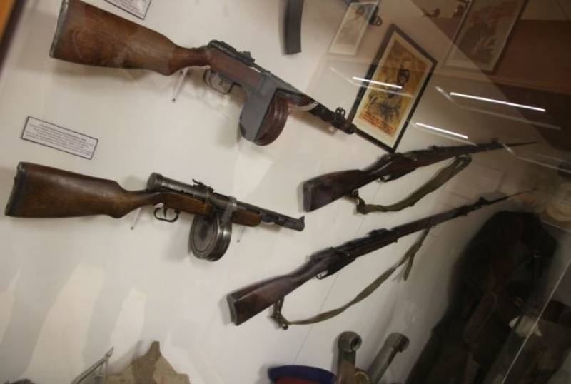 Panoplia de armamento ruso: subfusiles PPD-40, abajo a la izquierda; arriba se ve el PPSh-1941; y, a la derecha, 2 variantes del arma de cerrojo Mosin-Nagant.