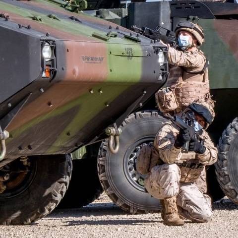 Los “Piranha” IIIC de línea están dotados de una torre tripulada armada con un lanzagranadas de 40 mm y una ametralladora de 12,70 mm. (foto José Antonio Almarza)