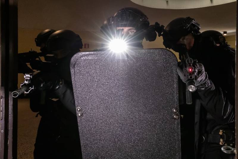 Aquí podemos ver en detalle a un agente K9 junto a su guía, pertrechado con el casco y pantalla antibalas.