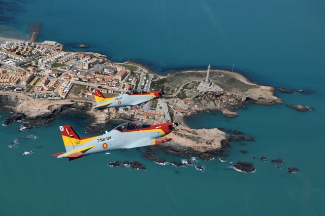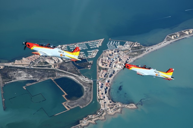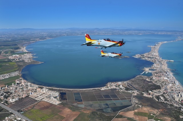 Magnifica imagen de dos PC-21 del Ejército del Aire sobrevolando la base aérea de San Javier, sede de la AGA.