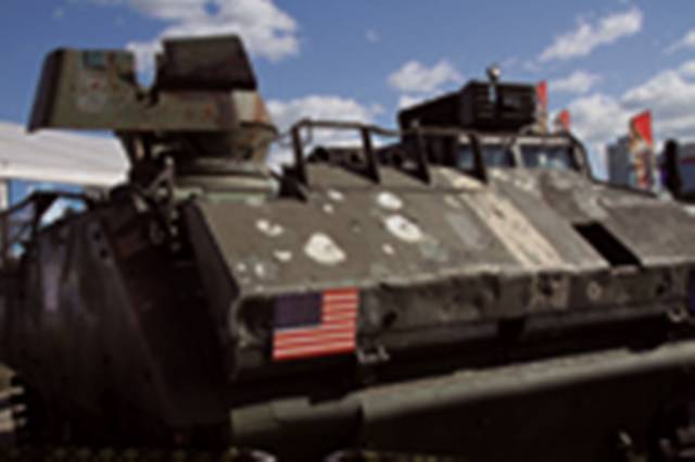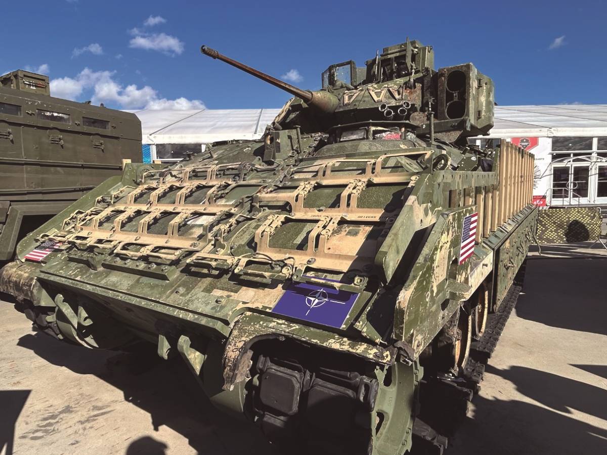Los rusos exhiben orgullosos los M-2 “Bradley” estadounidenses de combate en los que se aprecian soportes para refuerzos en el blindaje lateral y frontal.