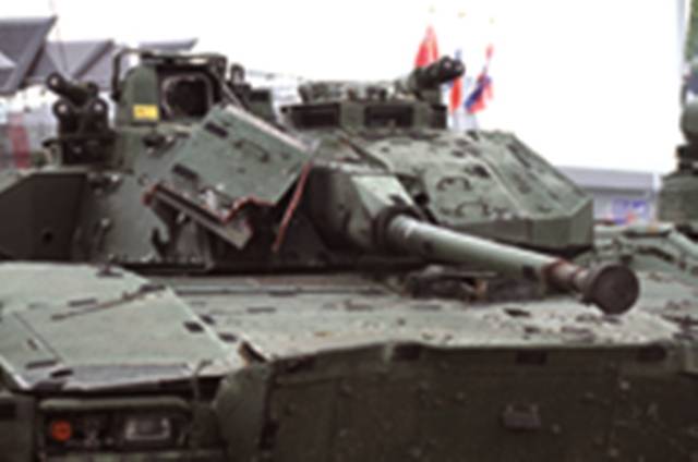 Vehículo de combate de infantería sueco CV90 con numerosos impactos en los módulos de blindaje frontal y en el visor de puntería principal.