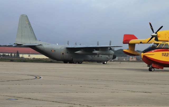 El “Hércules” pasa delante de los “apagafuegos” del 43 Grupo camino de la cabecera 22 de la base aérea de Torrejón. (foto Julio Maíz)