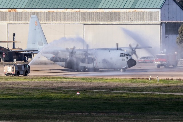 Los bomberos de la base aérea de Cuatro Vientos hacen el arco de agua al C-130H destinado al Museo. (foto Rubén Galindo)