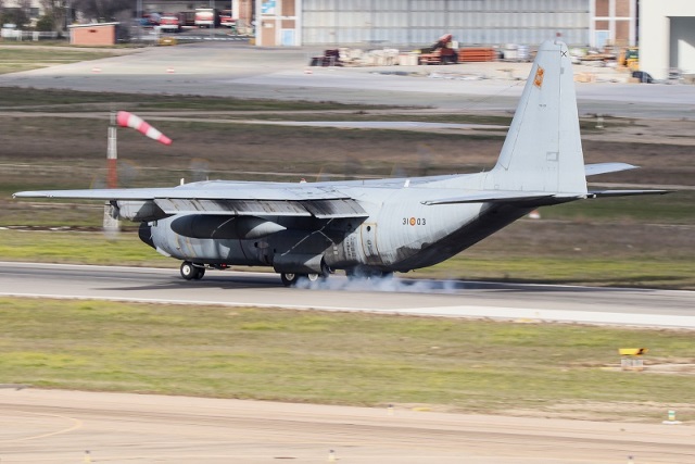 Momento en que el “Hércules” T.10-03 31-03 toca el suelo en la pista de Cuatro Vientos. (foto Rubén Galindo)