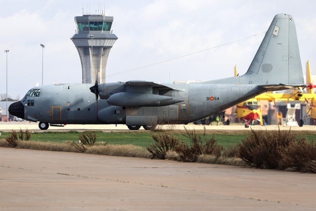La misma jornada del 29, otro “Hércules” del Ala 31 llegaba a la base aérea de Torrejón (Madrid), al fondo se ve su torre de control. (foto Rubén Galindo)
