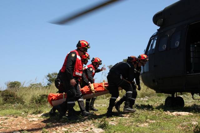 Simulacro de evacuación: la Unidad realiza continuos ejercicios con helicópteros, como los AS332 y AS532 “Super Puma” y “Cougar” (foto UME).