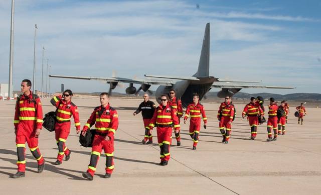 Efectivos tras desembarcar de un C-130H del Ejército del Aire. Aunque s la punta de lanza ante catástrofes en España, tiene a toda la estructura de las FAS detrás (foto UME).