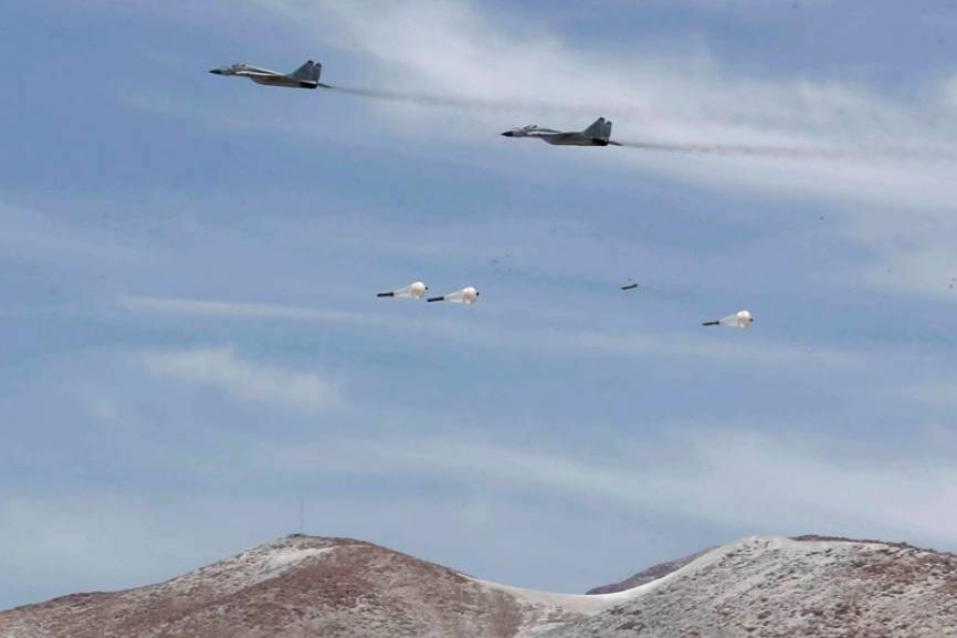 Dos MiG-29SMP del Grupo Aéreo Nº 6 lanzando Bombas OBAD-500PM de 500 kg.(Ministerio de Defensa del Perú)