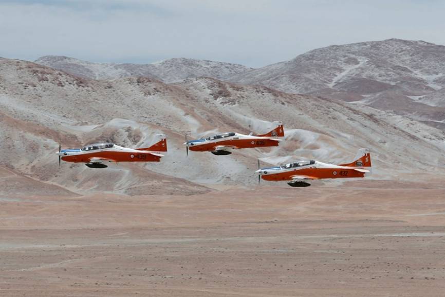 Una Escuadrilla de Aviones de Instrucción Embraer T-27 Tucano, armados con pods FN HMP-250 de 12.7 mm, aproximándose a sus blancos.
