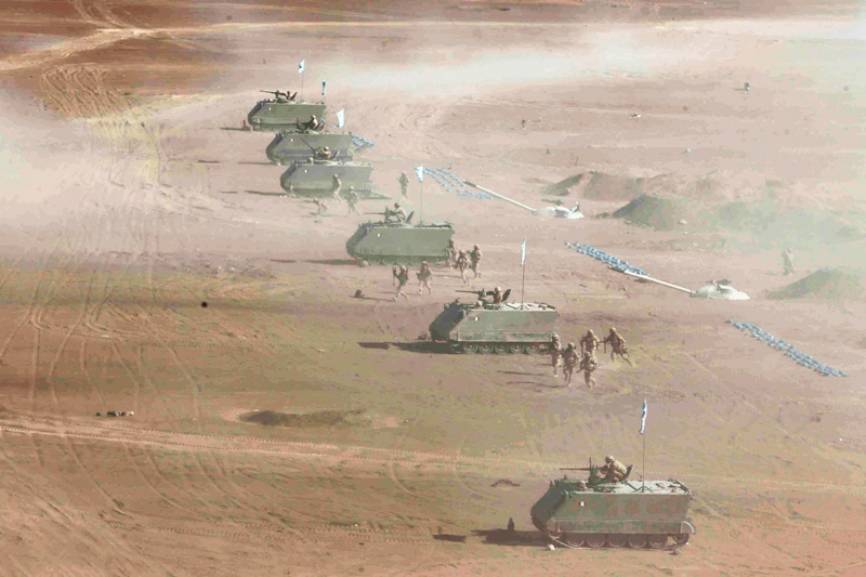 Efectivos del Ejército descendiendo desde Vehículos Blindados M-113A1. Se observa a dos Tanques T-55 en posiciones defensivas, debidamente semienterrados.(Ministerio de Defensa del Perú)