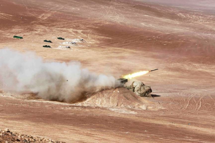 Lanzador Múltiple de Cohetes (MLRS) BM-21 Grad de 122 mm, debidamente camuflado, iniciando una salva de disparos.(Ministerio de Defensa del Perú)